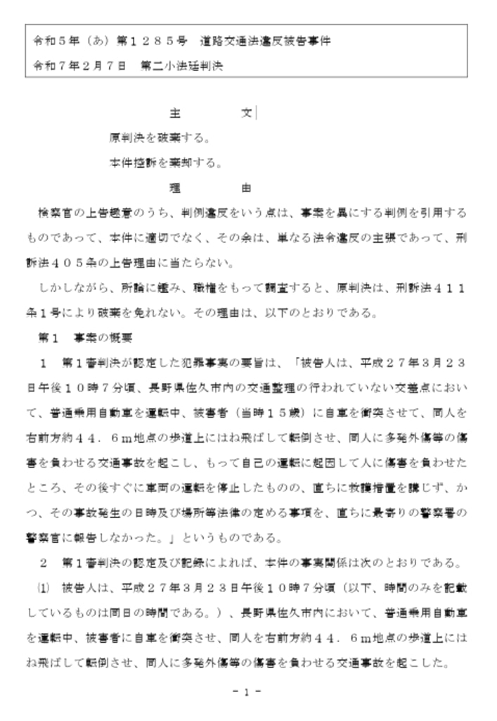 ⑴ 被告人は、平成27年3月23日午後10時7分頃(以下、時間のみを記載しているものは同日の時間である。)、長野県佐久市内において、普通乗用自動車を運転中、被害者に自車を衝突させ、同人を右前方約44.6m地点の歩道上にはね飛ばして転倒させ、同人に多発外傷等の傷害を負わせる交通事故を起こした。