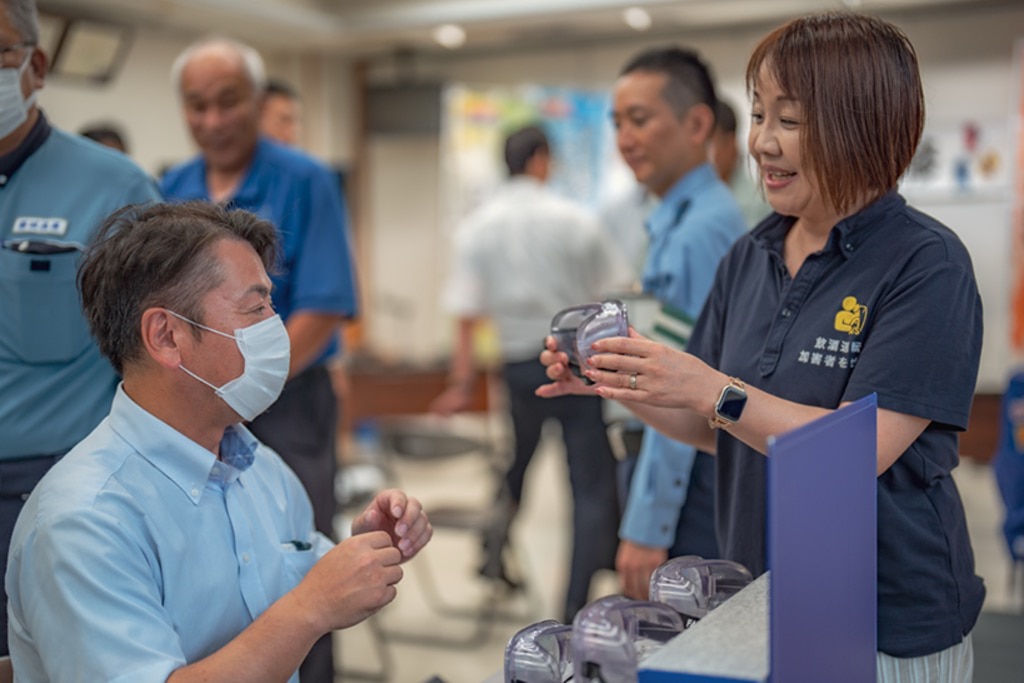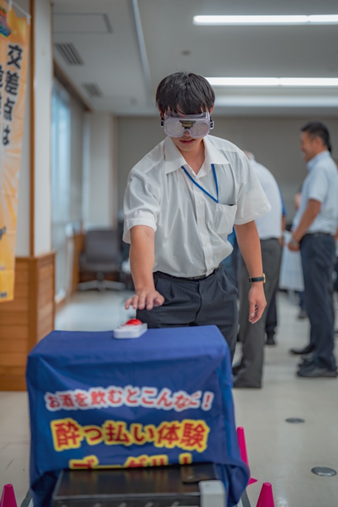 また、酩酊状態を体感できるゴーグルを装着し、飲酒によって平衡感覚が失われる危険性を直にご体感いただきました。