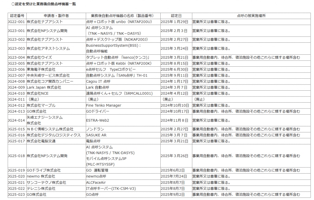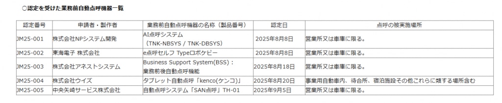 業務「前」自動点呼 国土交通省 認定機器 2つ追加。