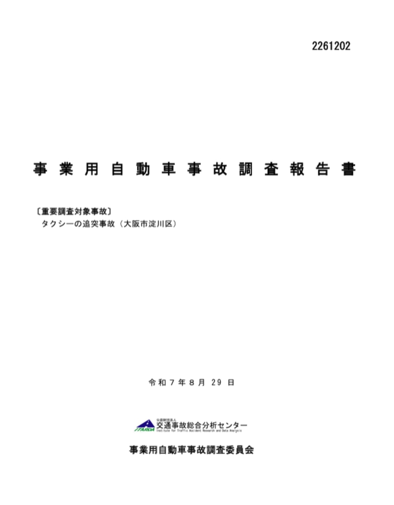 令和4年12月2日11時49分頃、タクシーが、大阪市淀川区田川北の府道41号線の三津屋跨線橋付近を十三駅方面に向けて空車により運行中、前を走る大型乗合バスに追突した。追突後もタクシーは、左に斜走し道路脇のマンションの外壁に衝突して停止した。 この事故により、タクシーの運転者が死亡し、大型乗合バスの運転者も軽傷を負った。
