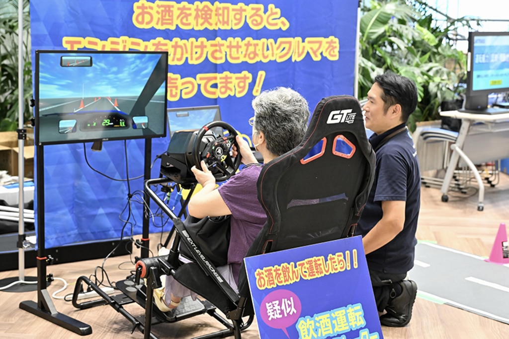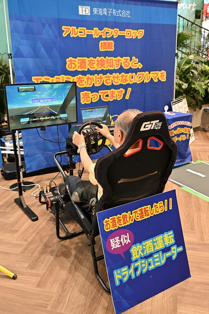 ドライブシミュレータによる飲酒運転疑似体験には、列ができるほどの盛況ぶりでした。