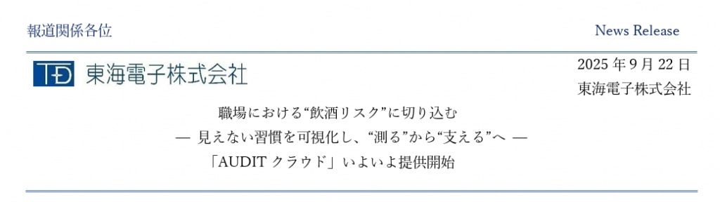 アルコール検知システム、IT点呼システム、運行管理システムを開発・販売する東海電子株式会社(本社:静岡県富士市、代表取締役:杉本 哲也)は、このたび、職場における見えない飲酒リスクを可視化し、従業員の気づきと行動変容を促す新サービスとして、クラウド型飲酒習慣管理「AUDITクラウド」を提供開始したことをお知らせいたします。