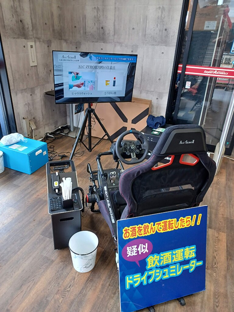 疑似飲酒運転体験ができるドライブシミュレータの横には、アルコールインターロックのデモ機を設置し、呼気中のアルコール濃度測定体験もセットでお試しいただけます。