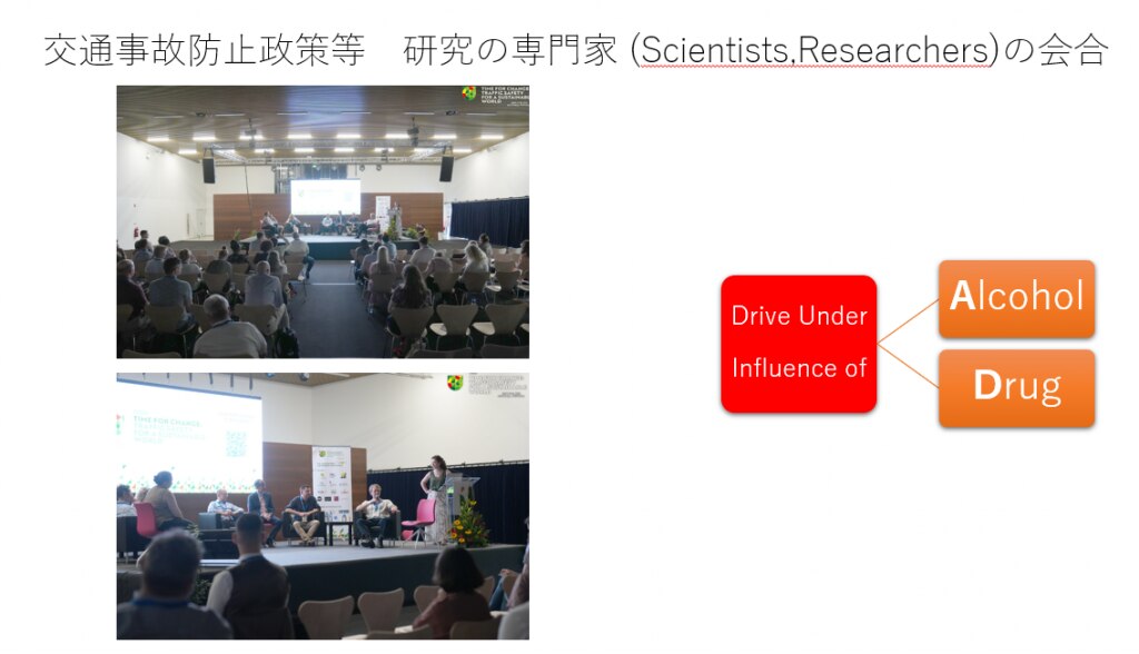 道路交通法やアルコール飲料、薬物の規制は、国によって違います。さまざまな国で、飲酒運転、薬物運転防止の「Professionals」たちがいて、日々、交通事故死者を減らすためにフィールドワークをし、調査研究し、論文を書いて、政策に反映させたりしています。