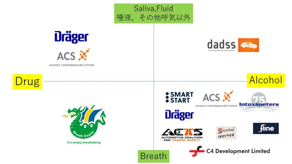 いずれも、アルコール検査機器、ドラッグ検査機器の類いですが、唾液、呼気等、サンプリング方式が違います。