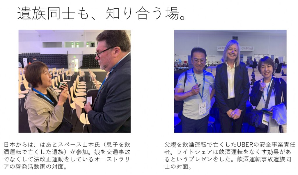 ひとりは、オーストラリアで娘さんを交通事故でなくされた方。もうひとりは 父親を飲酒運転でなくされた方で現在UBERドライバーへの交通事故教育担当をされているアメリカ人。