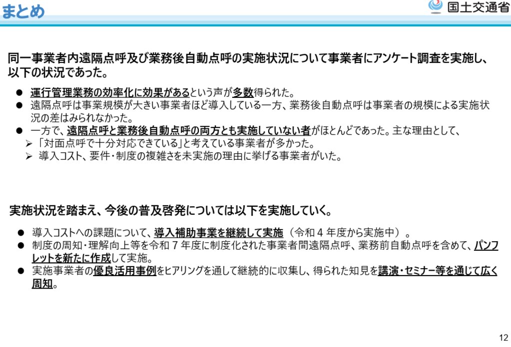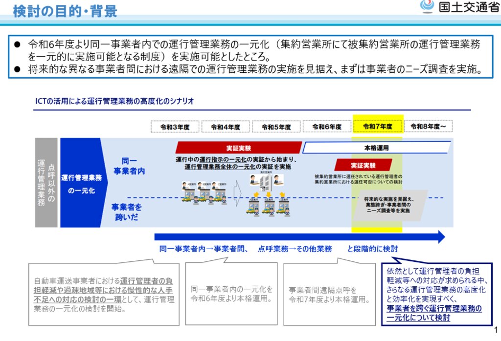 遠隔点呼が制度化され、自動点呼が制度化され、事業者間遠隔点呼が制度化され、運行管理一元化はあとはチューニングを残すだけ。