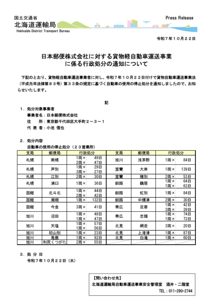 北海道運輸局、行政処分結果。あなたの近くの郵便局で車両は停止された?