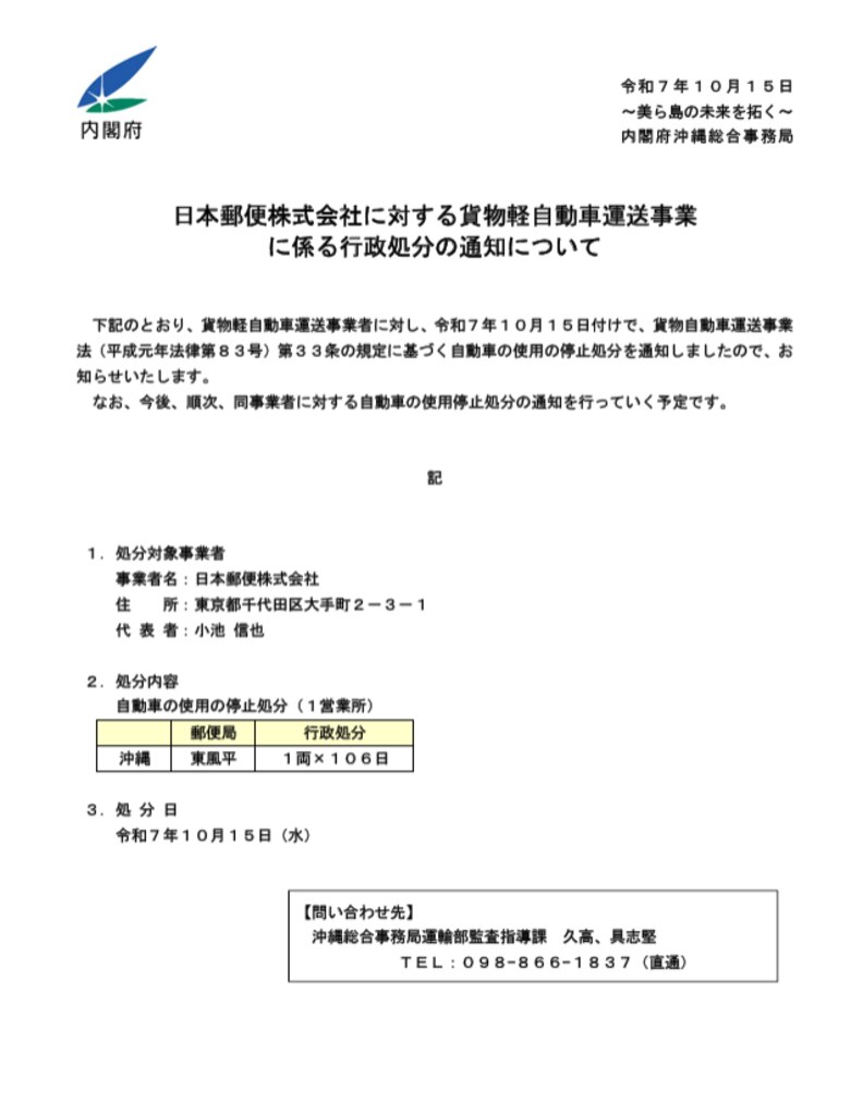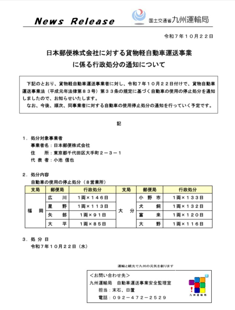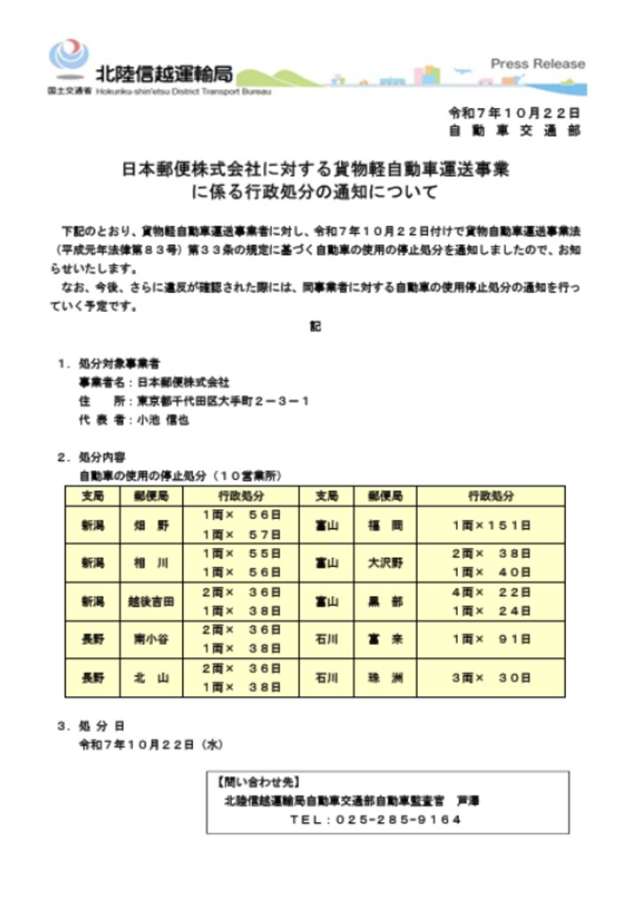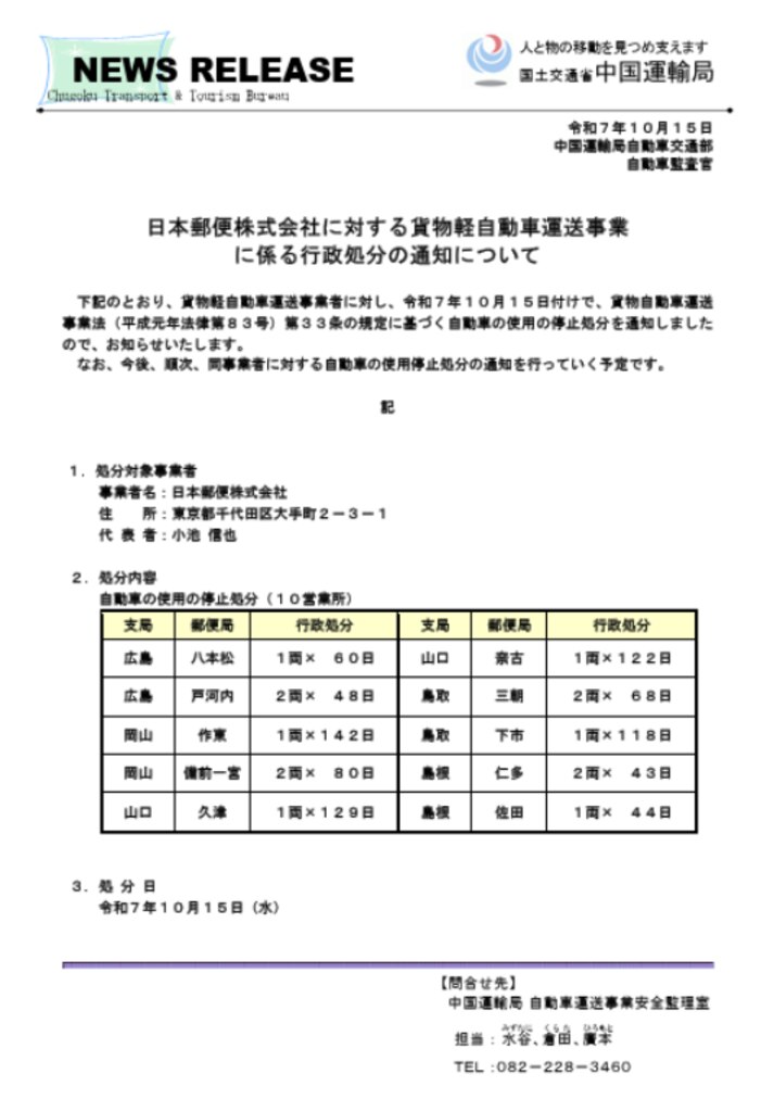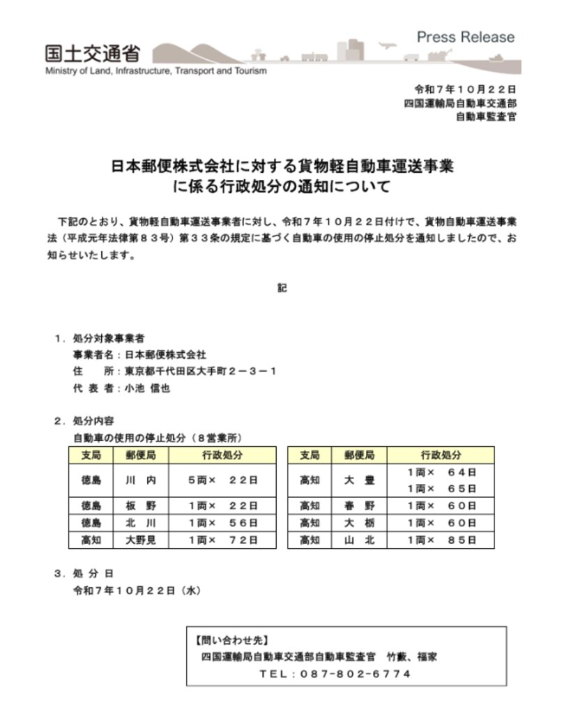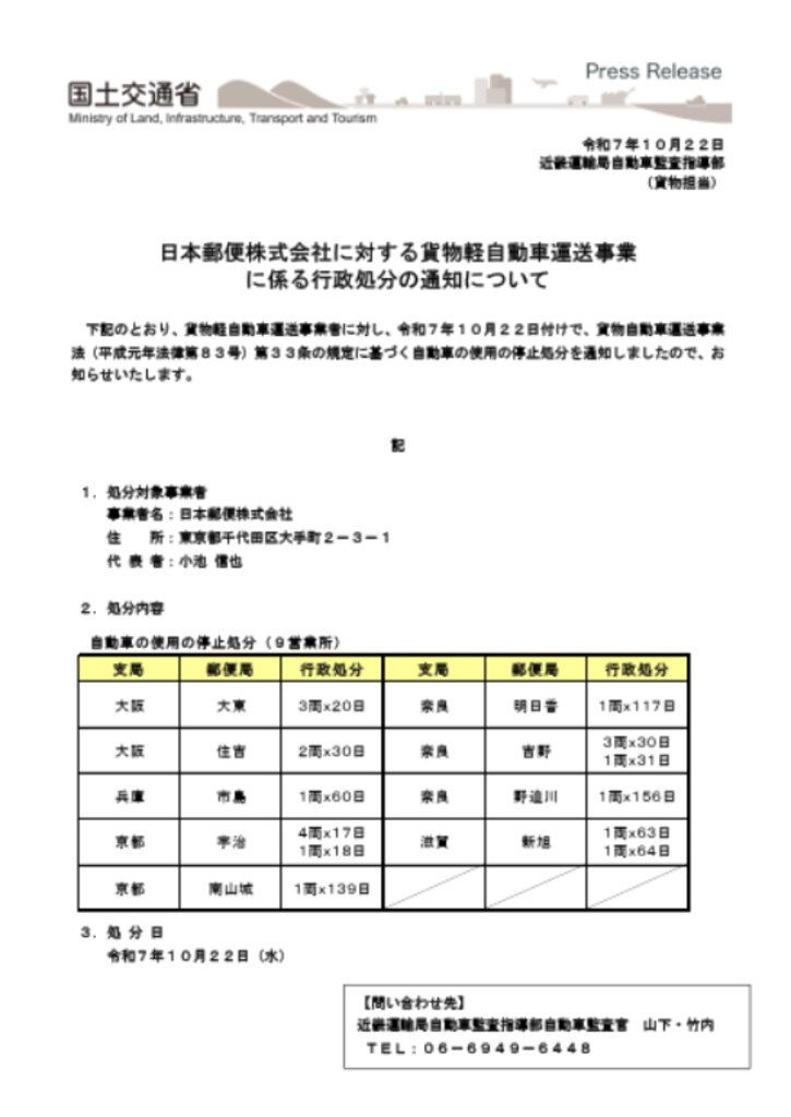 関東運輸局、行政処分結果。あなたの近くの郵便局で車両は停止された?