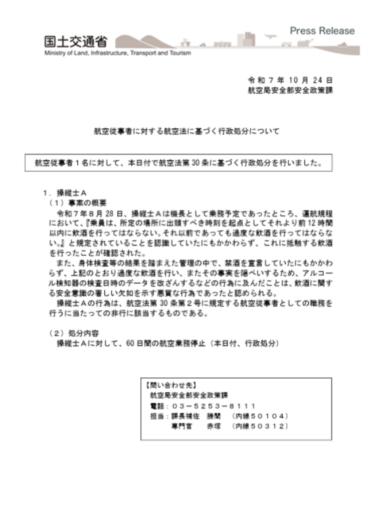 それにしても、お酒を飲む操縦士のみなさん、タイミングが悪すぎる。