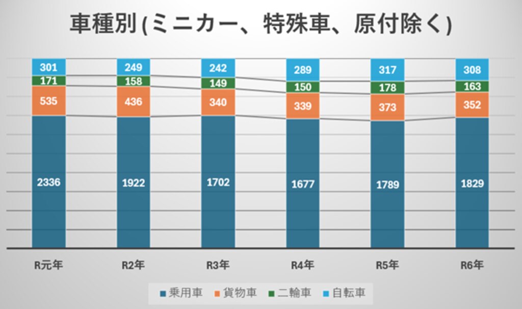 飲酒運転事故を車種別に見ると、最も多いのは乗用車で、全体の約7割を占めています。続いて貨物車が約15%前後を推移し、令和4年以降はやや増加傾向が見られます。