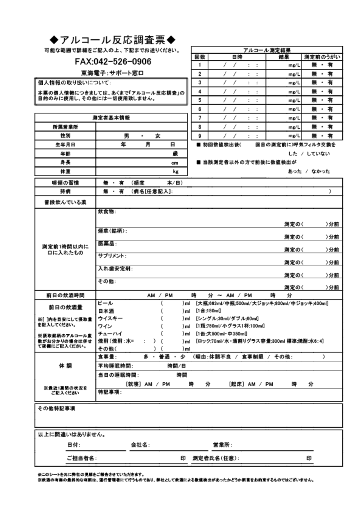 この調査票は、検知されたアルコール数値の原因を一つひとつ整理し、再現性を確認するためのツールです。測定時の状況(食事の有無・服薬・体調など)を丁寧に記録することで、「飲酒による反応」なのか、「その他の要因による一時的な反応」なのかを見極めることができます。