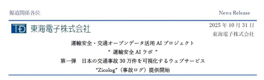 自動点呼システム、運行管理システム、安全運転管理システム、労働安全衛生システムを開発・販売する東海電子株式会社(本社:静岡県富士市 代表取締役:杉本哲也)は、この度、運輸安全・交通オープンデータ活用AIプロジェクト“運輸安全AIラボ”を立ち上げました。そしてまず第一弾として、日本の交通事故データ年間約30万件を可視化するウェブサービス、“Zicolog”(事故ログ)の提供を開始いたします。