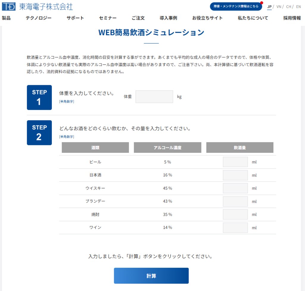 当社(東海電子)でも、ウェブサイトやアプリで、飲酒量や代謝計算ツールを無償で提供しています。