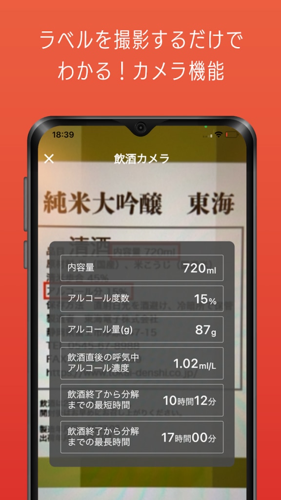 まず、アルコール飲料のラベルから、アルコール量を読み取る機能。