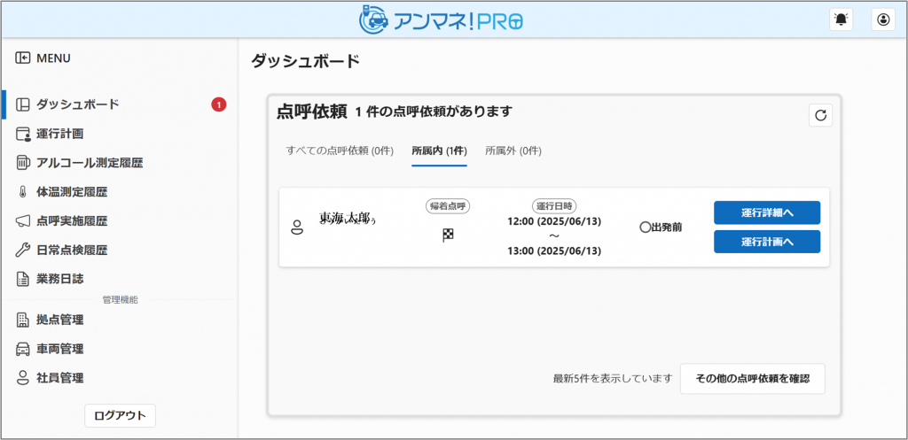 まず、ログインをすると出てくる画面がダッシュボードです。ここには点呼依頼が表示されます。