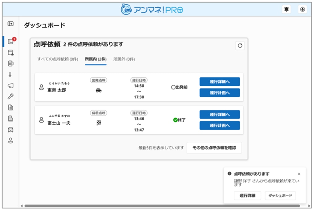 『点呼依頼』の画面内表示は運転者から点呼依頼が入ると、更新され、迅速な対応を支援します。点呼依頼が入ると同時に、画面下部にポップアップで通知が届き、タイムリーな対応が可能となります。