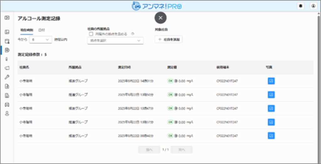 アルコール測定は運行の中で複数回実施されることが想定されますので、現在時刻を起点に「6時間以内、12時間以内、24時間以内」の結果を一覧表示することができるようになっています。合わせて、写真の箇所をクリックいただくことで、測定時の写真もご覧いただくことができます。