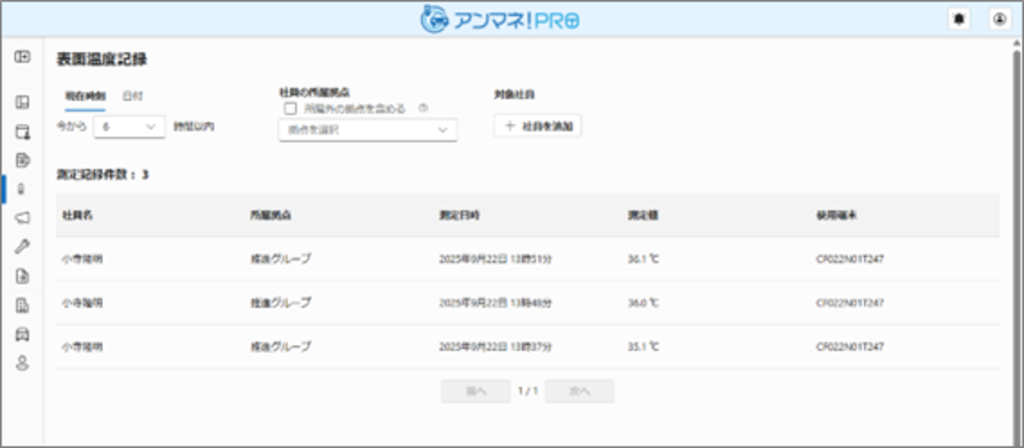 アルコール測定同様、表面温度の測定結果を確認することができます。