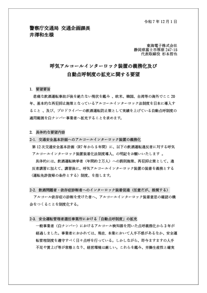 東海電子は2025年12月1日、警察庁交通局交通企画課長様宛に、「呼気アルコールインターロック装置の義務化及び自動点呼制度の拡充に関する要望」を手渡し致しました。