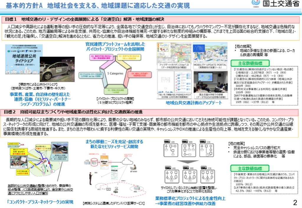 日本版ライドシェア・公共ライドシェアの導入による政策効果のモニタリングを実施し、更なる制度改善等を企画・実施する。さらに、利用者利便を向上させる観点から、配車アプリの導入を促進するなど、地域交通のDXを推進する。また、公共ライドシェアについては、その性格や役割(非営利性、公共交通の補完的役割等)を維持しつつ、広域での輸送ニーズ等に対応するための実施主体の拡大についても検討していく。