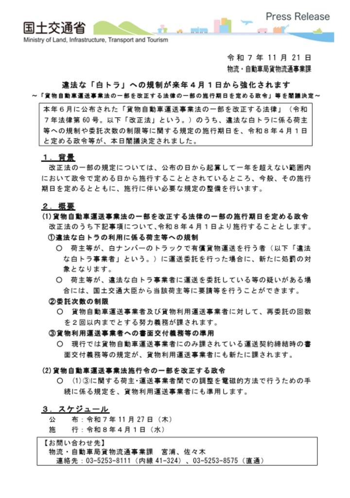 違法な「白トラ」への規制が来年4月1日から強化されます ~「貨物自動車運送事業法の一部を改正する法律の一部の施行期日を定める政令」等を閣議決定~