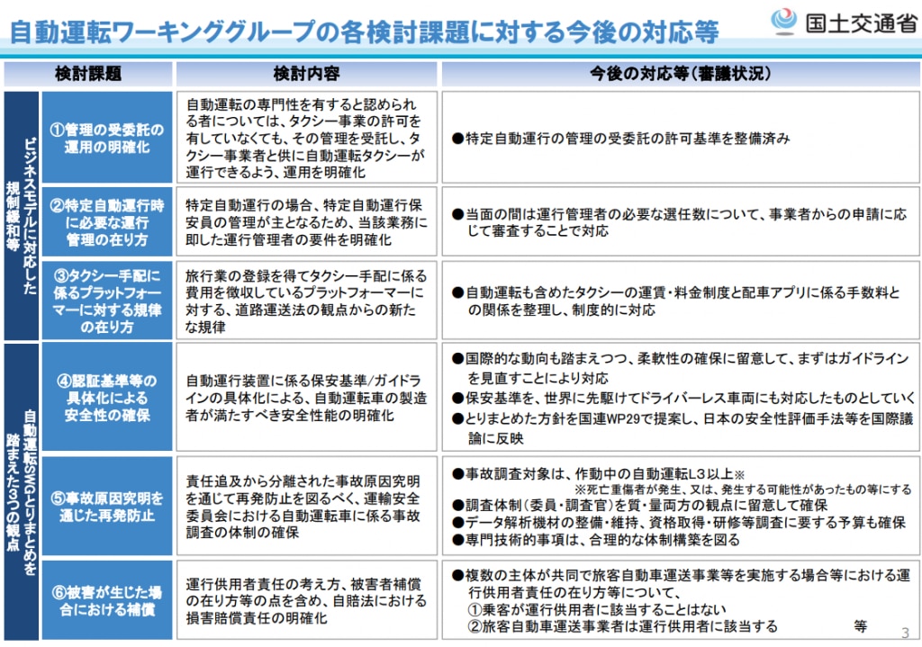 ○ 自動運転の時代になっても、車内事故防止など日本ならではの安全性への配慮を世界に示せるよう議論を進めてほしい。