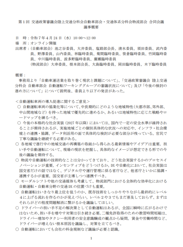 第1回 交通政策審議会陸上交通分科会自動車部会・交通体系分科会物流部会 合同会議(2025年4月24日)