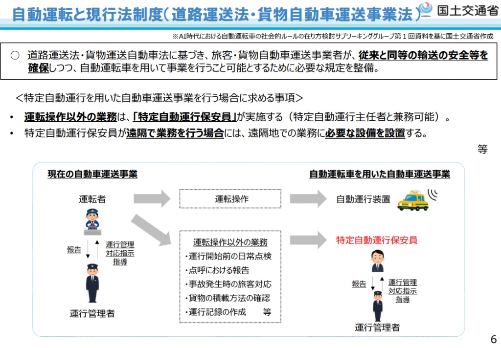 ○ レベル4の自動運転サービスに関する許認可手続が複雑であり、見直しが必要。現行制度では道路運送車両法及び道路交通法に加え、道路運送法又は貨物自動車運送事業法に基づく手続が必要だが、自動運転サービスでは判断項目が重複したり相互の関連性が強くなったりしてくるため、関係法令間の連携を強化し、合理化を図るべき