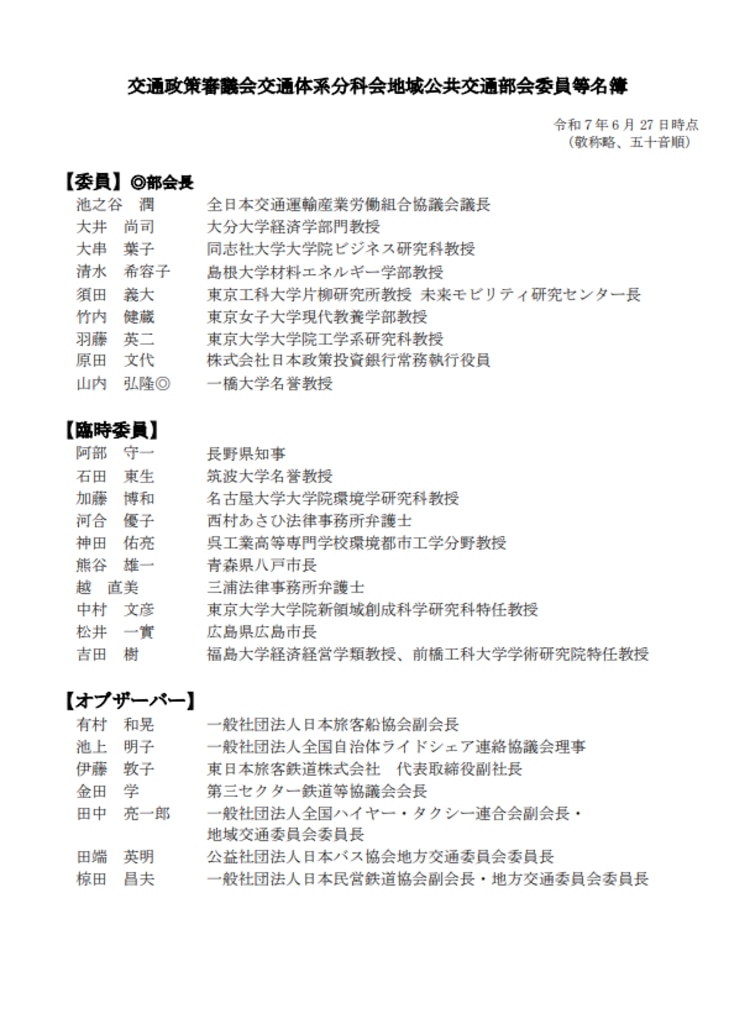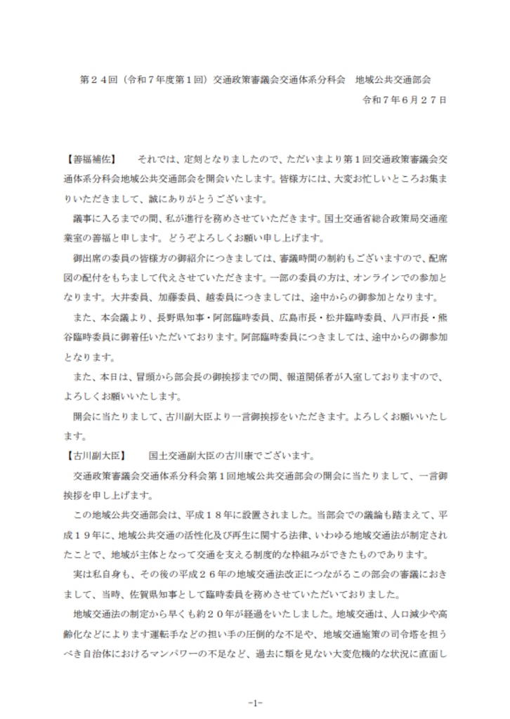 令和7年度第1回(第24回)交通政策審議会交通体系分科会地域公共交通部会(2025年6月27日)