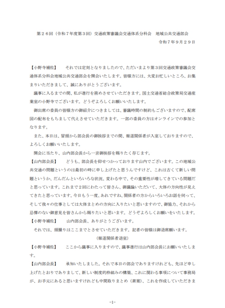 令和7年度第3回(第26回)交通政策審議会交通体系分科会地域公共交通部会(2025年9月29日)