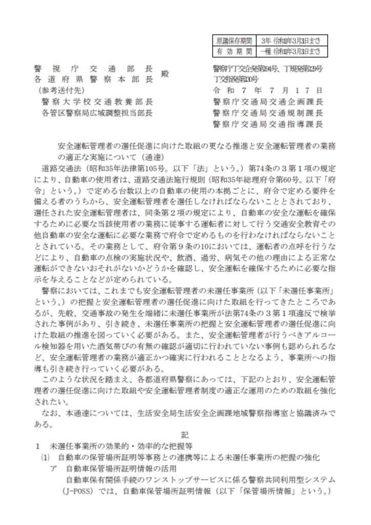 去る2025年7月、警察庁から安全運転管理者の未選任事業所に関する通達が出ました。