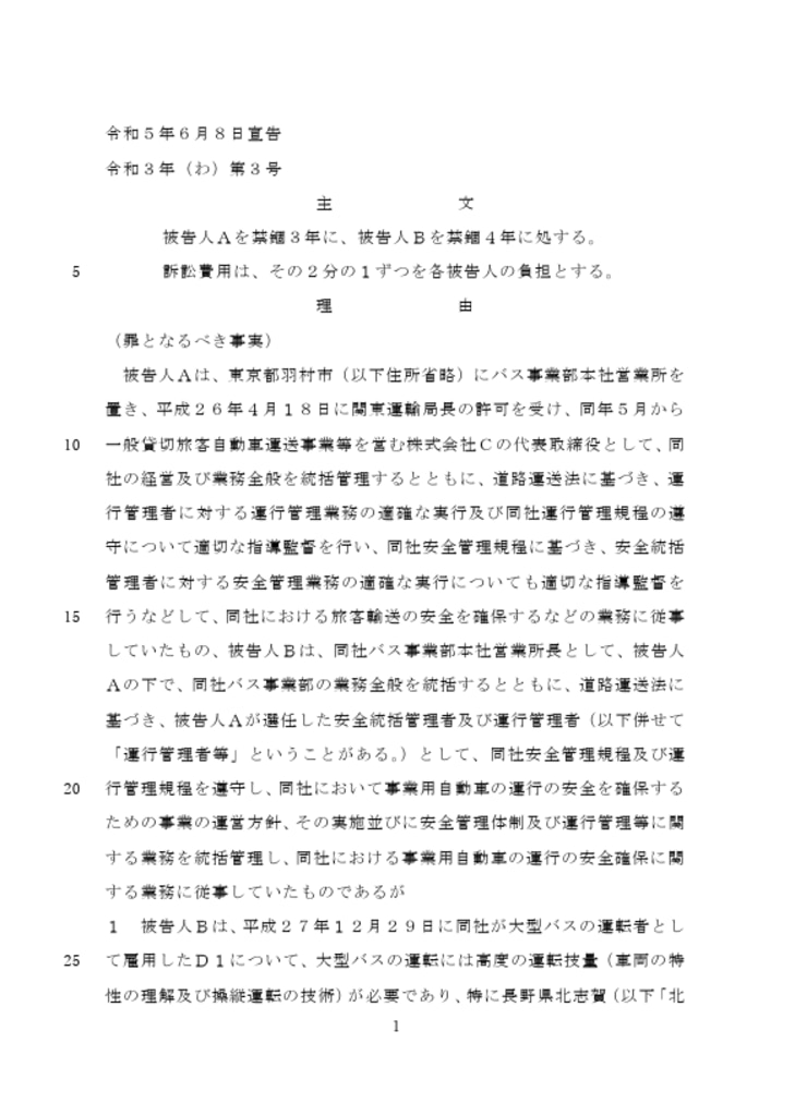 バス会社社長 有罪禁錮3年 < 運行管理者 有罪禁固4年