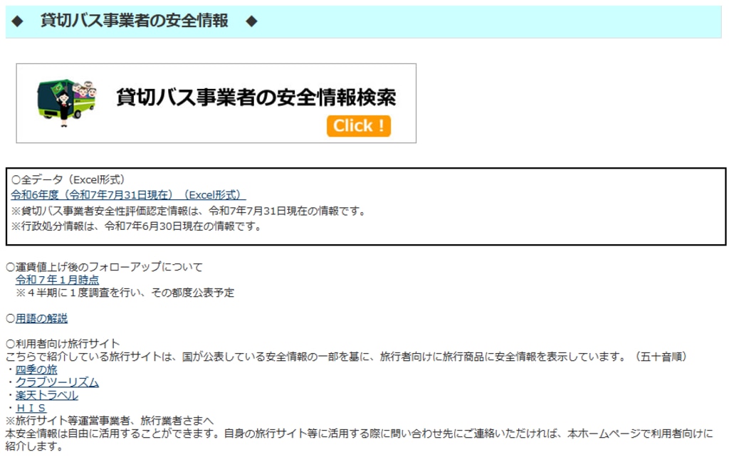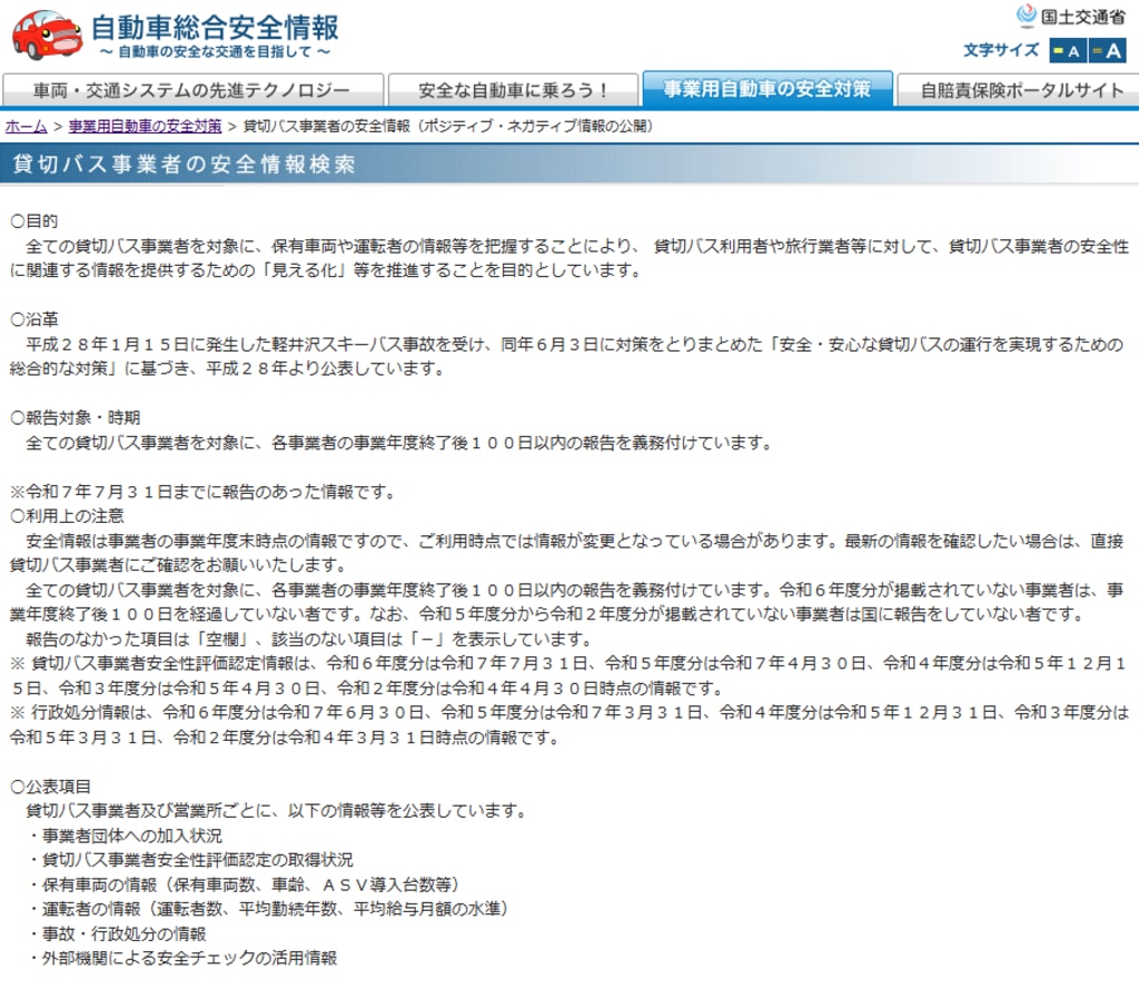 貸切バス事業者及び営業所ごとに、以下の情報等を公表しています。