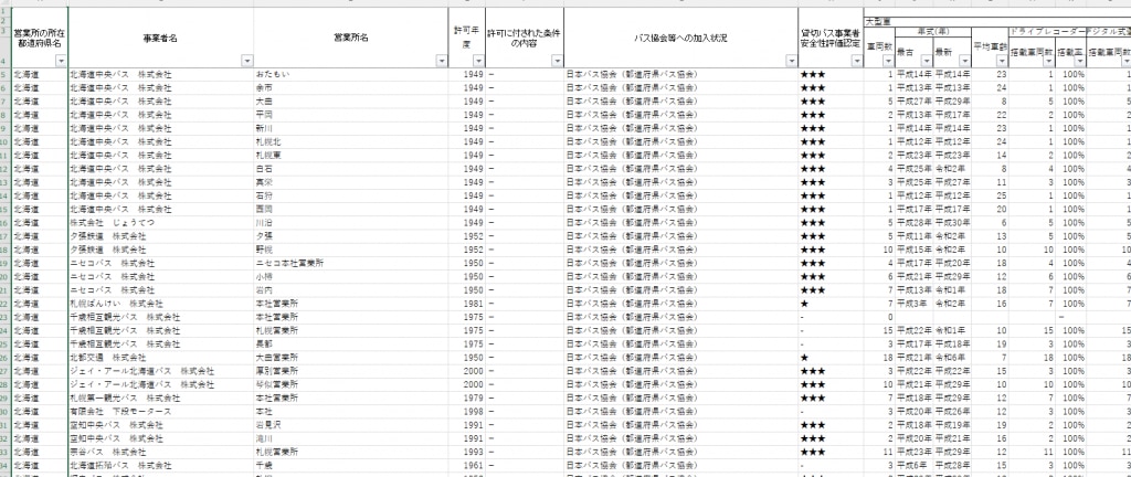 エクセルファイルをダウンロードすると、国土交通省・運輸局に報告された事業者のすべての安全情報を見ることができます。