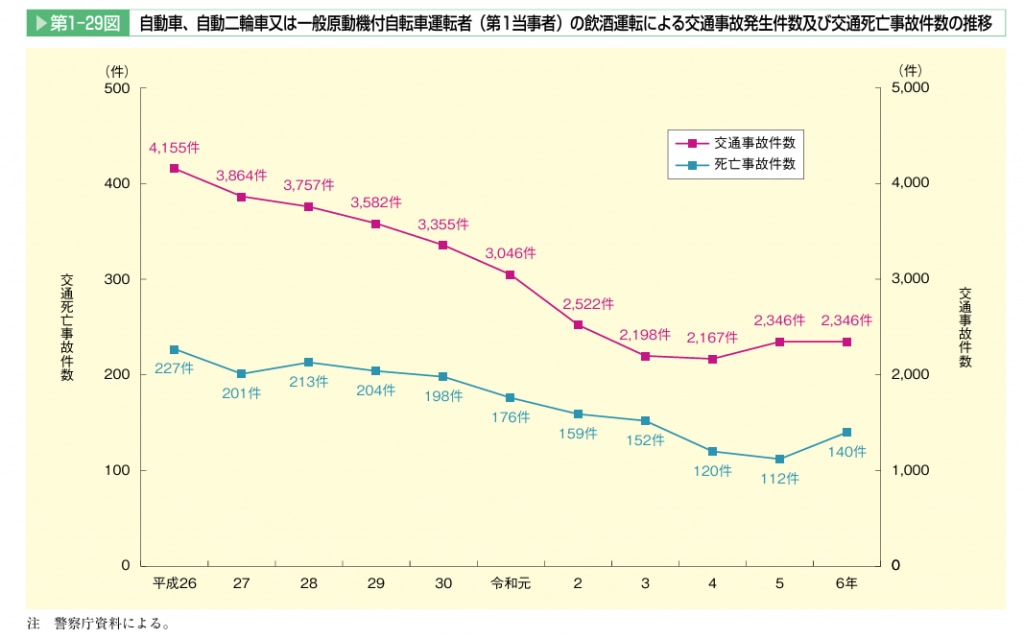 ⑺飲酒運転根絶に向けた交通安全教育及び広報啓発活動等の推進令和6年中の飲酒運転による交通事故件数は2,346件で、23年ぶりに増加に転じた昨年と同数となった。ア 「飲酒運転を許さない社会環境づくり」の取組 飲酒運転の危険性や飲酒運転による交通事故の実態等について積極的に広報するとともに、飲酒が運転等に与える影響について理解を深めるため、映像機器や飲酒体験ゴーグルを活用した参加・体験型の交通安全教育を推進した。また、交通ボランティアや交通安全関係団体、酒類製造・販売業、酒類提供飲食業等の関係業界と連携して、(一財)全日本交通安全協会等が推進している「ハンドルキーパー運動※」への参加を広く国民に呼び掛けるなど、関係機関・団体等と連携して「飲酒運転を絶対にしない、させない」という国民の規範意識の更なる向上を図った。 また、運転免許の取消し等の処分を受けた飲酒運転違反者※に対し、飲酒行動の改善等のためのカリキュラムを盛り込んだ取消処分者講習(飲酒取消講習)や、停止処分者講習を実施し、飲酒運転の危険性等についての重点的な教育を行った。 さらに、安全運転管理者による運転者に対するアルコール検知器を用いた酒気帯びの有無の確認等の義務について、安全運転管理者に対する講習の機会等を活用することにより、履行の徹底を図った。