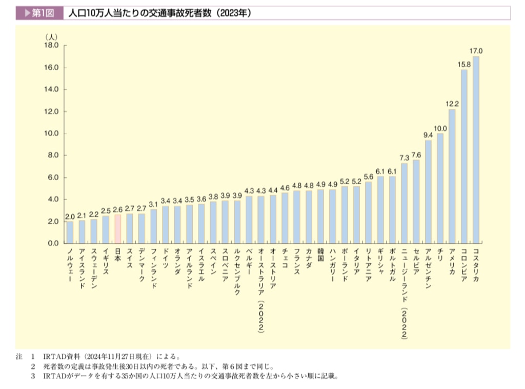 国際道路交通事故データベース(IRTAD)がデータを有する35か国について、人口10万人当たりの交通事故死者数(第1図)を比較すると、我が国は2.6人であり、5番目に少ない。