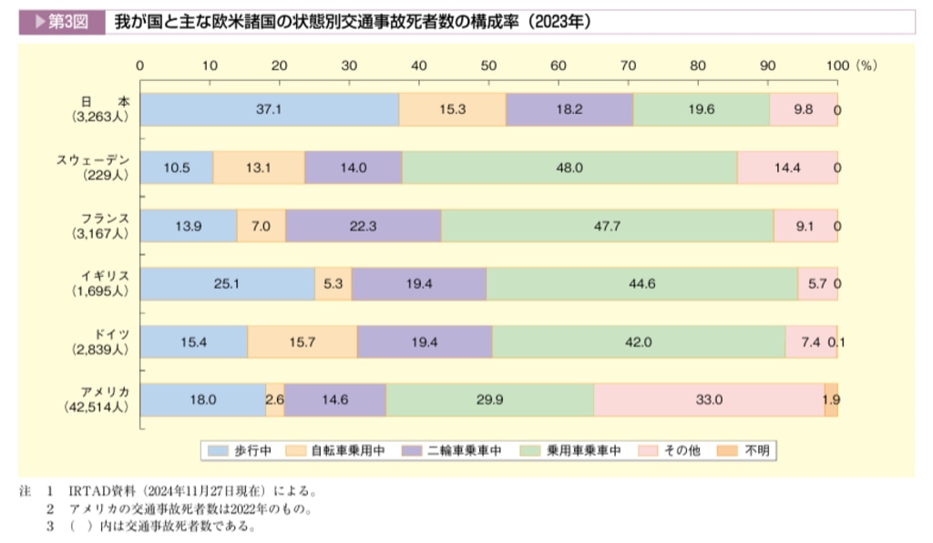 我が国は、歩行中と自転車乗用中を合わせた死者数の構成率が他国と比べて高く、乗用車乗車中の死者数の構成率が他国と比べて低い。