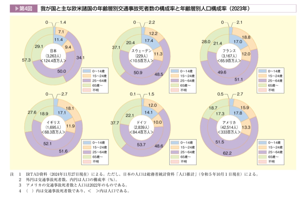我が国と主な欧米諸国の年齢層別交通事故死者数の構成率と年齢層別人口構成率(第4図)をみると、我が国は、65歳以上の年齢層の交通事故死者数の構成率(57.3%)が人口構成率(29.1%)と比較して約28ポイント高く、他国と比べて差が大きい。また、0~14歳の年齢層の交通事故死者数の構成率(1.4%)が人口構成率(11.4%)と比較して10ポイント低く、他国と比べて差が小さい。