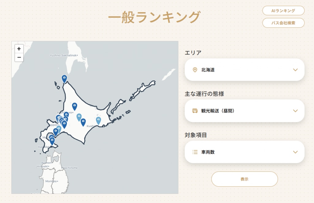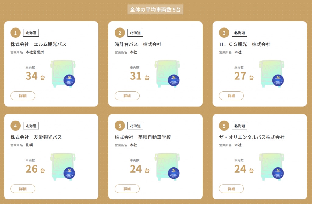 たとえば、「北海道でいちばん貸切車両を多くもってる会社は?」を調べたいとき。一社一社のウェブサイトを調べる必要はありません。なかには、保有台数がわからなかったりそもそもウェブサイトがない会社もあったりします。