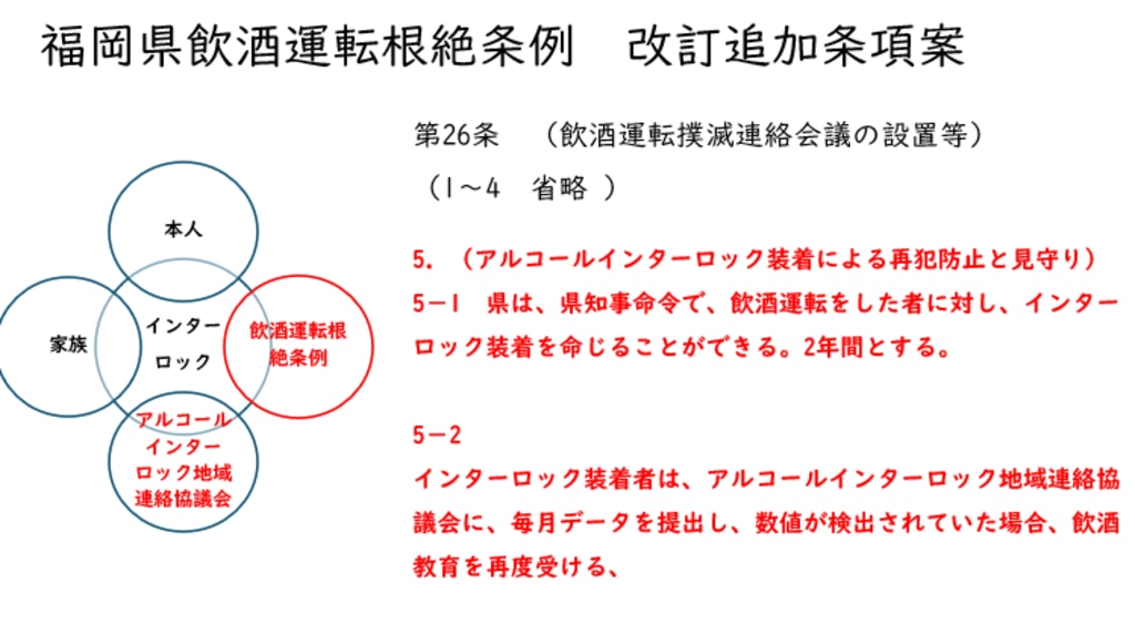 福岡県飲酒運転防止条例は、通報義務・アルコール依存症受診義務までは条項に盛り込まれています。あとはアルコールインターロック装着条項を26条に加えれば、「飲酒運転根絶のため、できることは何でもやる」条例となる。