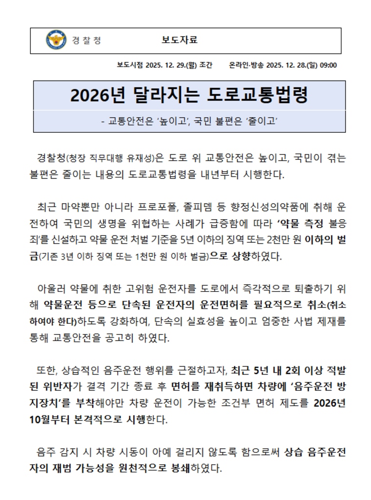 韓国の警察庁が、年末12月28日に、新年2026年の主要な道路交通法改正を広報しました。