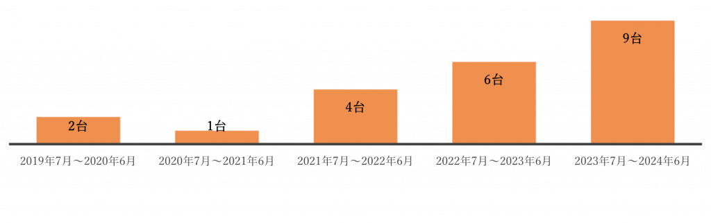 2011年に緑ナンバー、2022年に白ナンバー、ともに事業者へのアルコール検知器使用義務化の影響を受け台数を伸ばした年がありましたが、ここ3年は一定のニーズはありながらも、200台以下とやや低調な実績となっています。本来、「飲酒運転検挙者」向けの機器であるがゆえ、事業者向け市場においては、多彩なアルコール検知器の中でその存在が埋もれている格好と言えます。