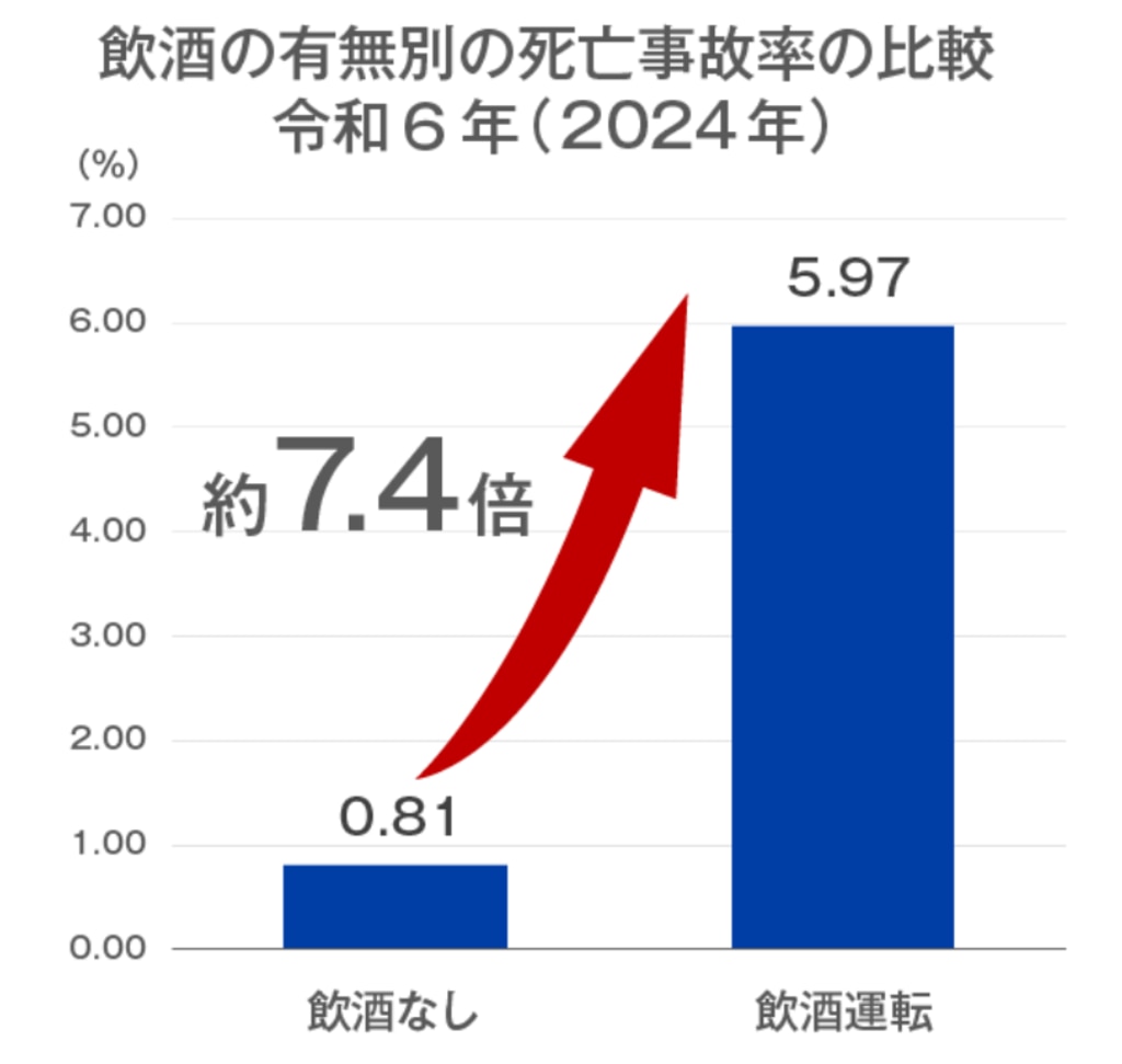 飲酒していない場合と比べて、死亡事故率は約7.4倍高いとされています。