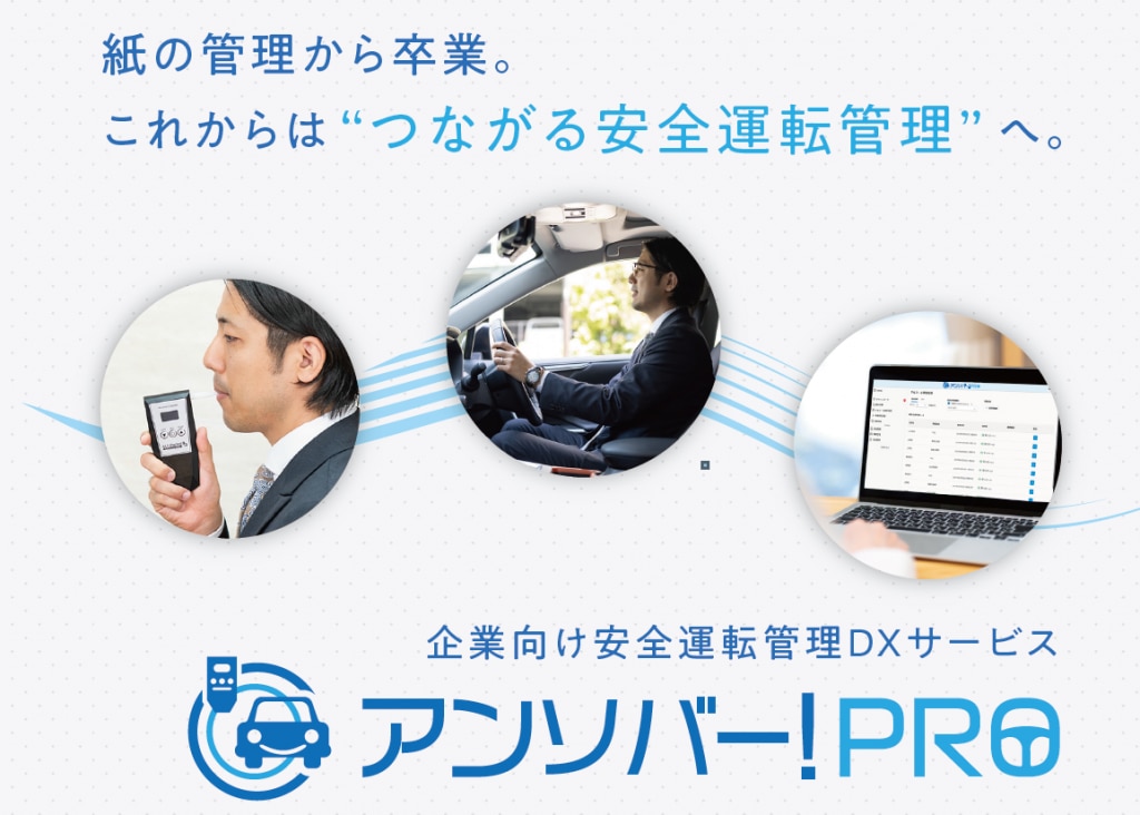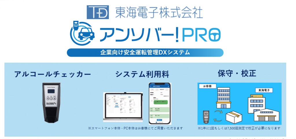 アンソバー!PROは、アルコール検知器メーカーである東海電子が開発した、白ナンバー事業者向け安全運転管理DXシステムです。