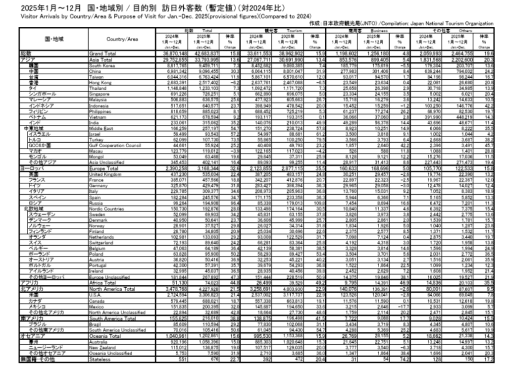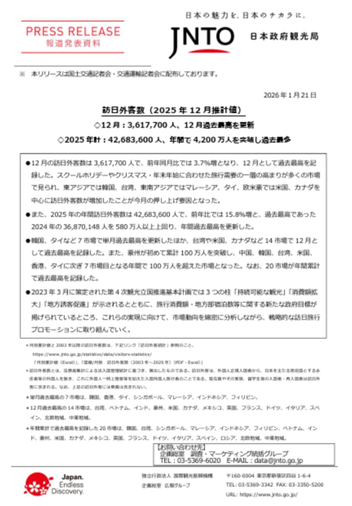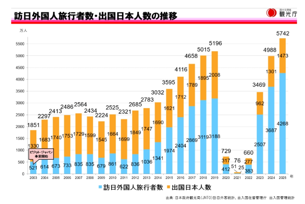 2025年(1-12月)、年間訪日外国人旅行者が4268万人と、過去最高となった。
