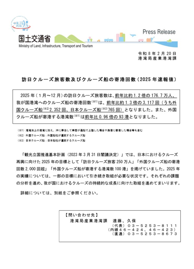 訪日クルーズ旅客数及びクルーズ船の寄港回数(2025年速報値)