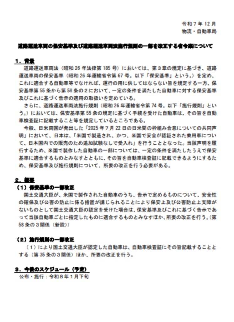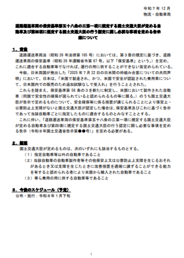 米国で製造され、かつ、米国で安全が認証された乗用車について、日本国内での販売のため追加試験なしで受入れ。