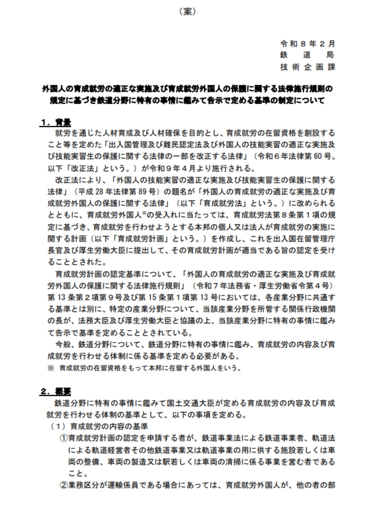 今般、鉄道分野について、鉄道分野に特有の事情に鑑み、育成就労の内容及び育成就労を行わせる体制に係る基準を定める必要がある。