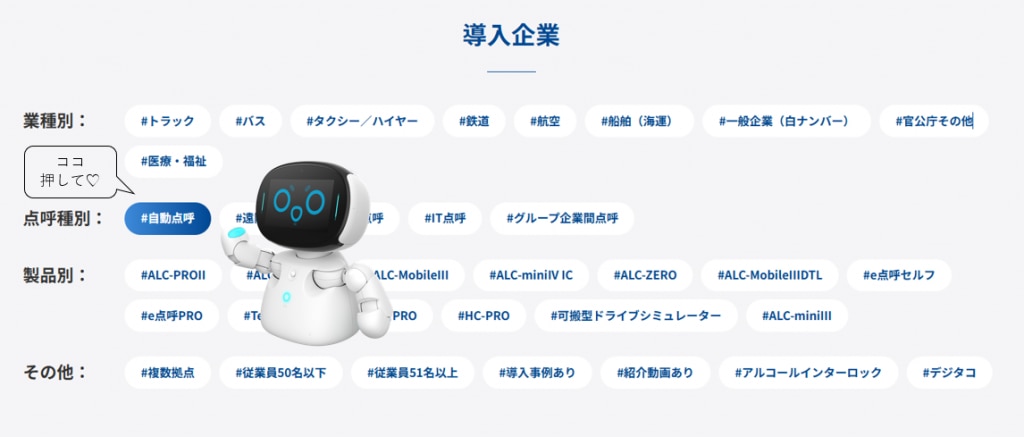 上記フィルターには、「業種」「従業員規模」の区分がありますので、「ウチと同じくらいの企業がロボット点呼なんて導入してるのだろうか」という確認もできます。